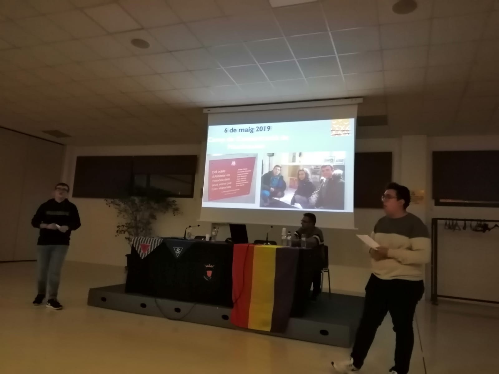 El mal temps no ens va impedir, ahir, inaugurar la VII Setmana Cultural. Moltes gràcies als assistents i moltes felicitats a l'Adrià, el Pau i el David per la xerrada que ens van fer. En una de les fotografies que ens van mostrar es pot veure la placa que ells van ficar al camp de Mauthausen en nom de tots els vilatans i vilatanes d'Almenar. Moltes gràcies.
